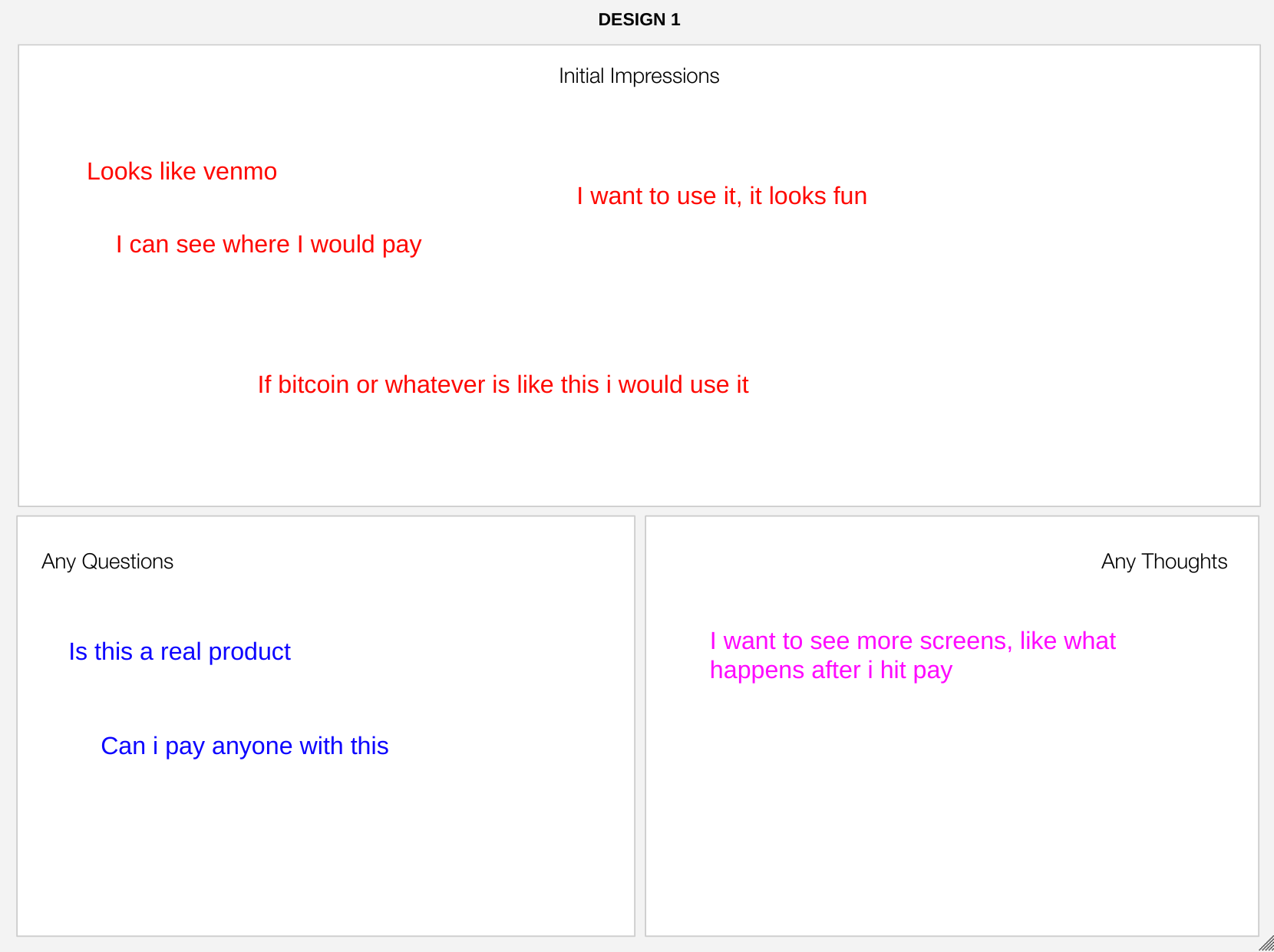 Using a feedback capture grid I was able to create some early validation that although participants were unclear as to how cryptocurrency worked and whether or not they should use it, they were much more likely to approach a personalized experience and tended to create higher reviews for the social profile experience.