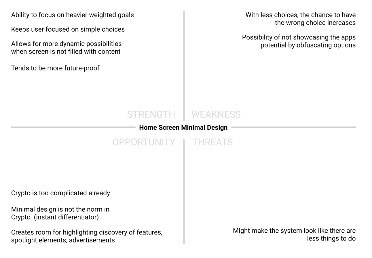 After analysing the SWOT and identifying the value in OPPORTUNITIES we have, it seemed logical to model DASH home screen after what customers were NOT familiar with in crypto—a clean non assuming open home screen. My proposal was fairly well received but this did not get me off the hook as each department still had their needs that were written in stone. I had to solve the problem so that everyone's requests were still a priority.